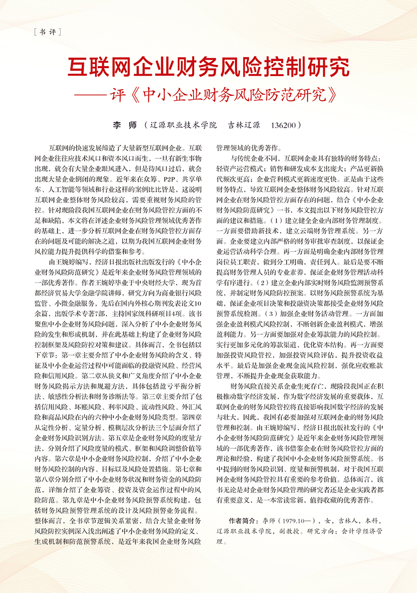 | 互联网企业财务风险控制研究——评《中小企业财务风险防范研究》 |