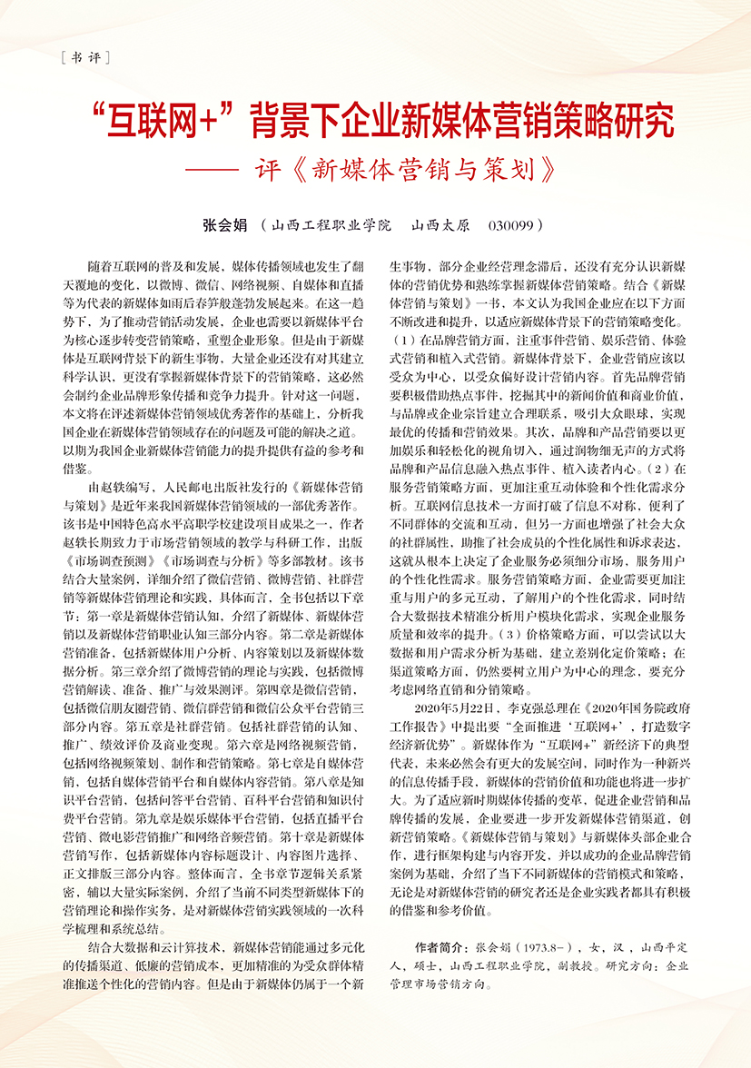 | “互联网+”背景下企业新媒体营销策略研究 —— 评《新媒体营销与策划》 |