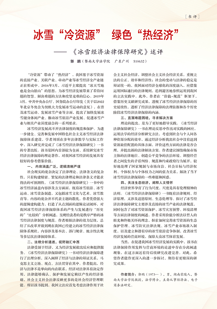 | 冰雪“冷资源” 绿色“热经济”——《冰雪经济法律保障研究》述评 |