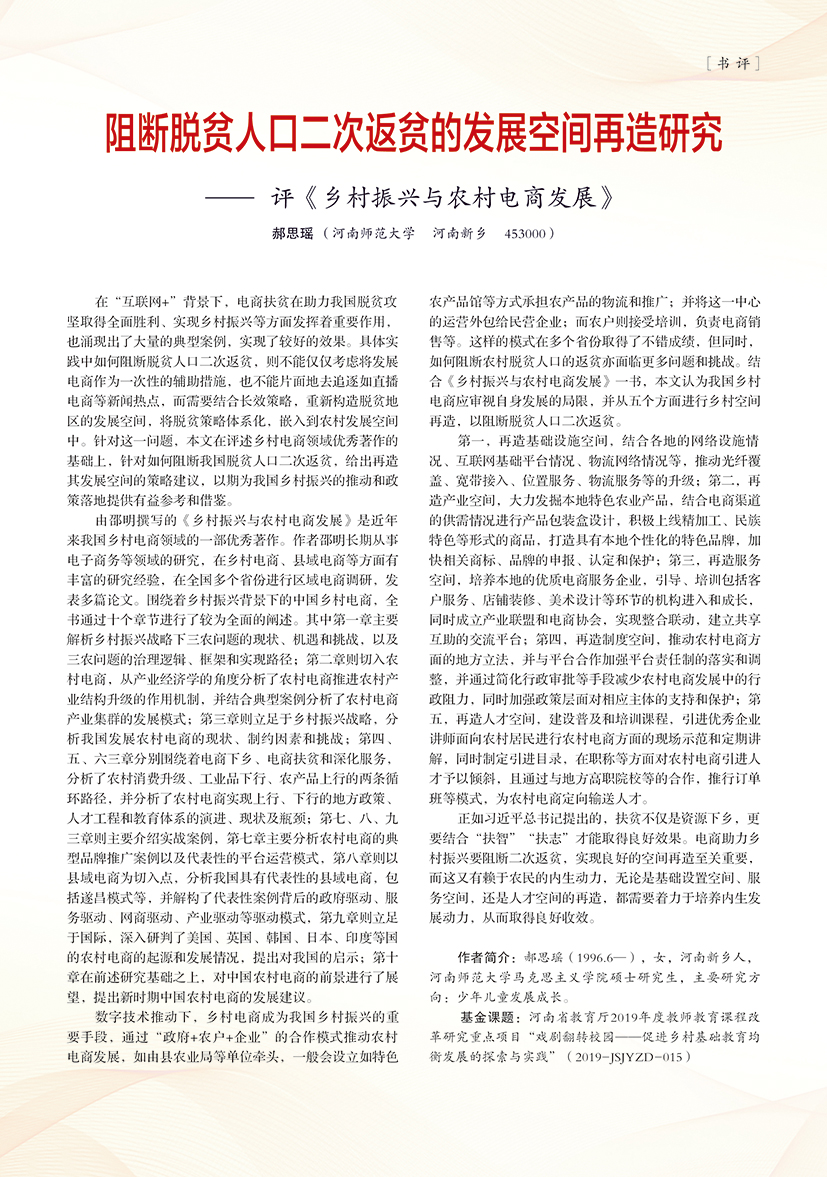 | 阻断脱贫人口二次返贫的发展空间再造研究——评《乡村振兴与农村电商发展》 |