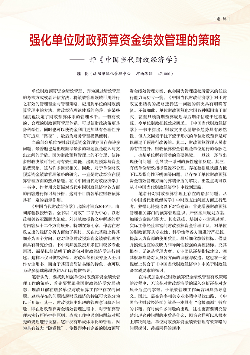 | 强化单位财政预算资金绩效管理的策略 —— 评《中国当代财政经济学》 |
