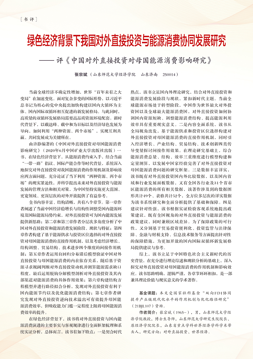 | 绿色经济背景下我国对外直接投资与能源消费协同发展研究 —— 评《中国对外直接投资对母国能源消费影响研究》 |