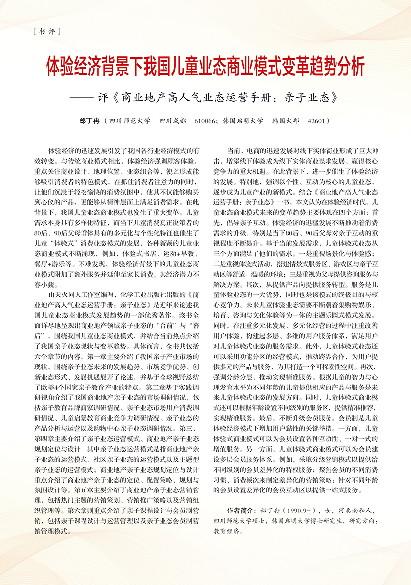 | 体验经济背景下我国儿童业态商业模式变革趋势分析 ——评《商业地产高人气业态运营手册:亲子业态》 |
