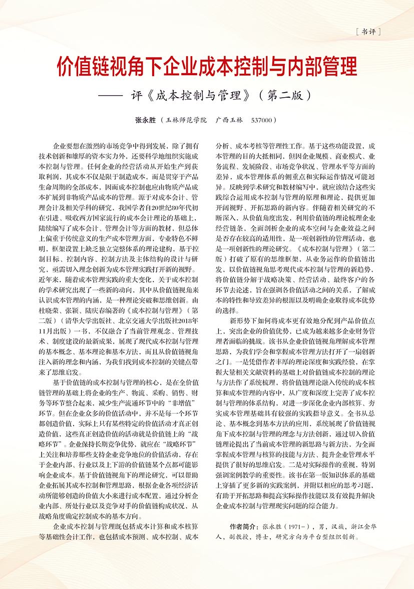 | 价值链视角下企业成本控制与内部管理—评《成本控制与管理》(第二版) |