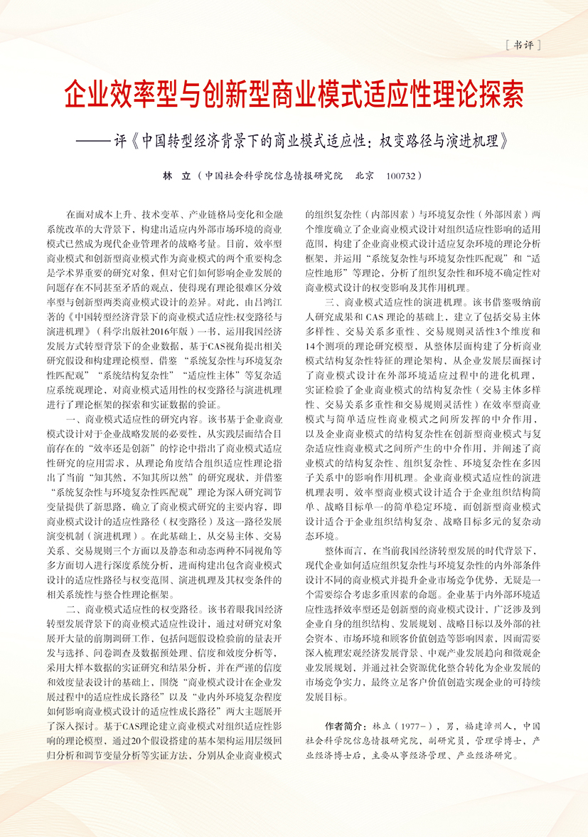 | 企业效率型与创新型商业模式适应性理论探索 ——评《中国转型经济背景下的商业模式适应性:权变路径与演进机理》 |