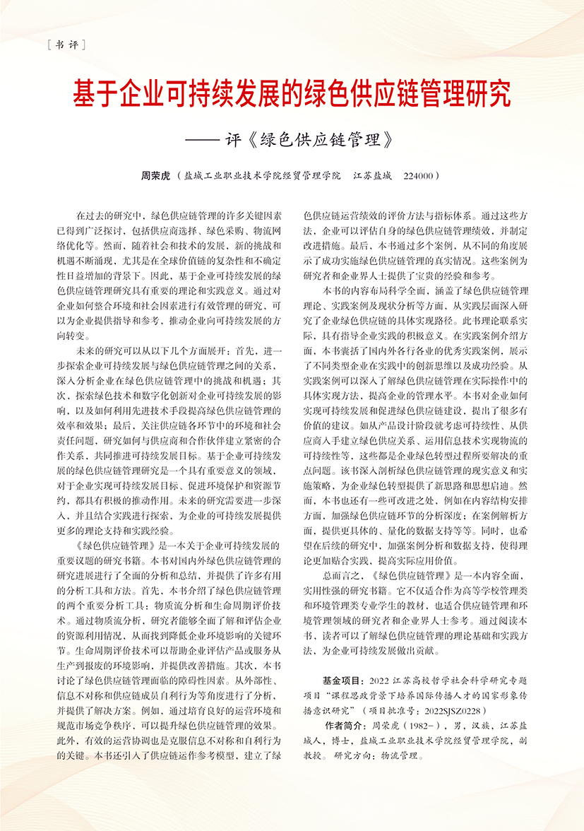 | 基于企业可持续发展的绿色供应链管理研究 ——评《绿色供应链管理》 |