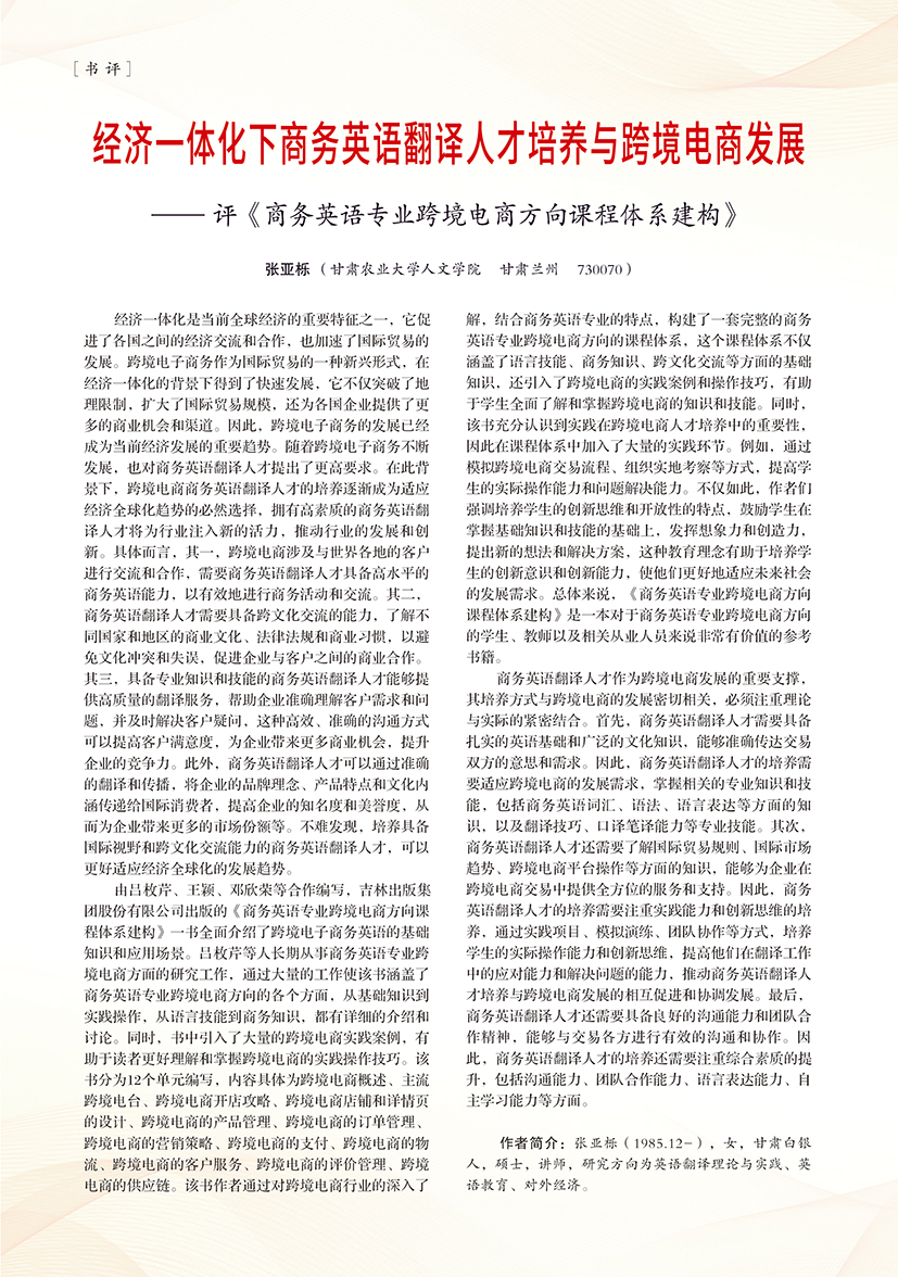 | 经济一体化下商务英语翻译人才培养与跨境电商发展——评《商务英语专业跨境电商方向课程体系建构》 |