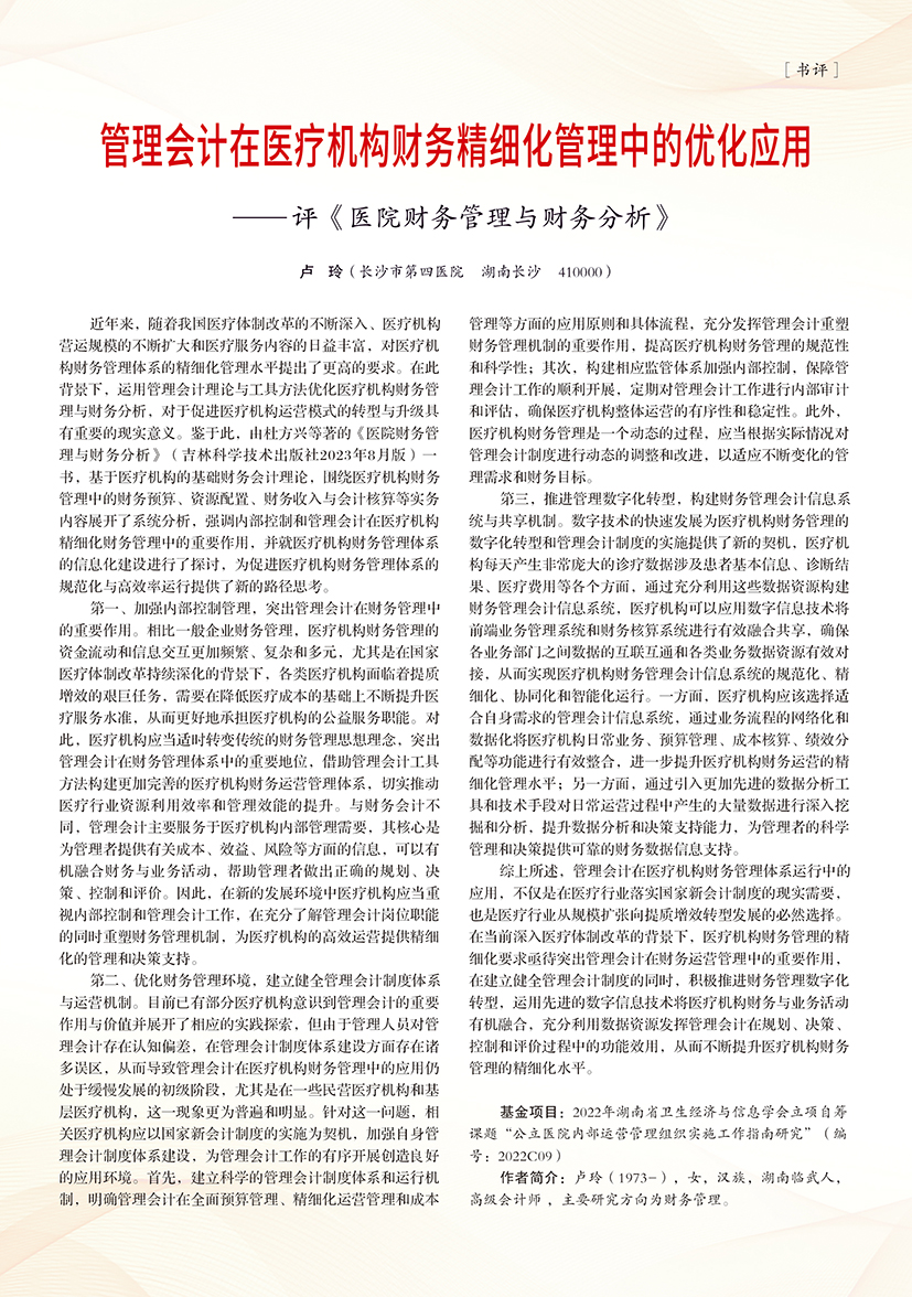| 管理会计在医疗机构财务精细化管理中的优化应用——评《医院财务管理与财务分析》 |