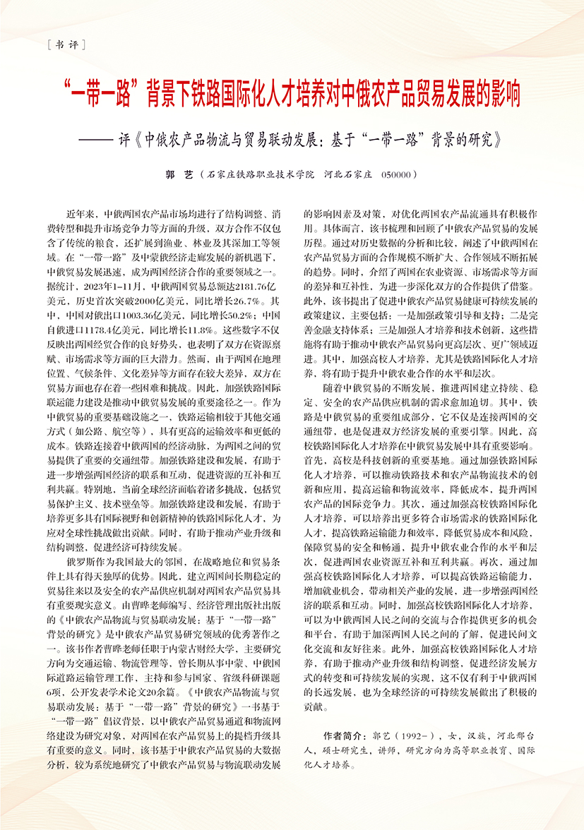 | “一带一路”背景下铁路国际化人才培养对中俄农产品贸易发展的影响 ——评《中俄农产品物流与贸易联动发展:基于“一带一路”背景的研究》 |