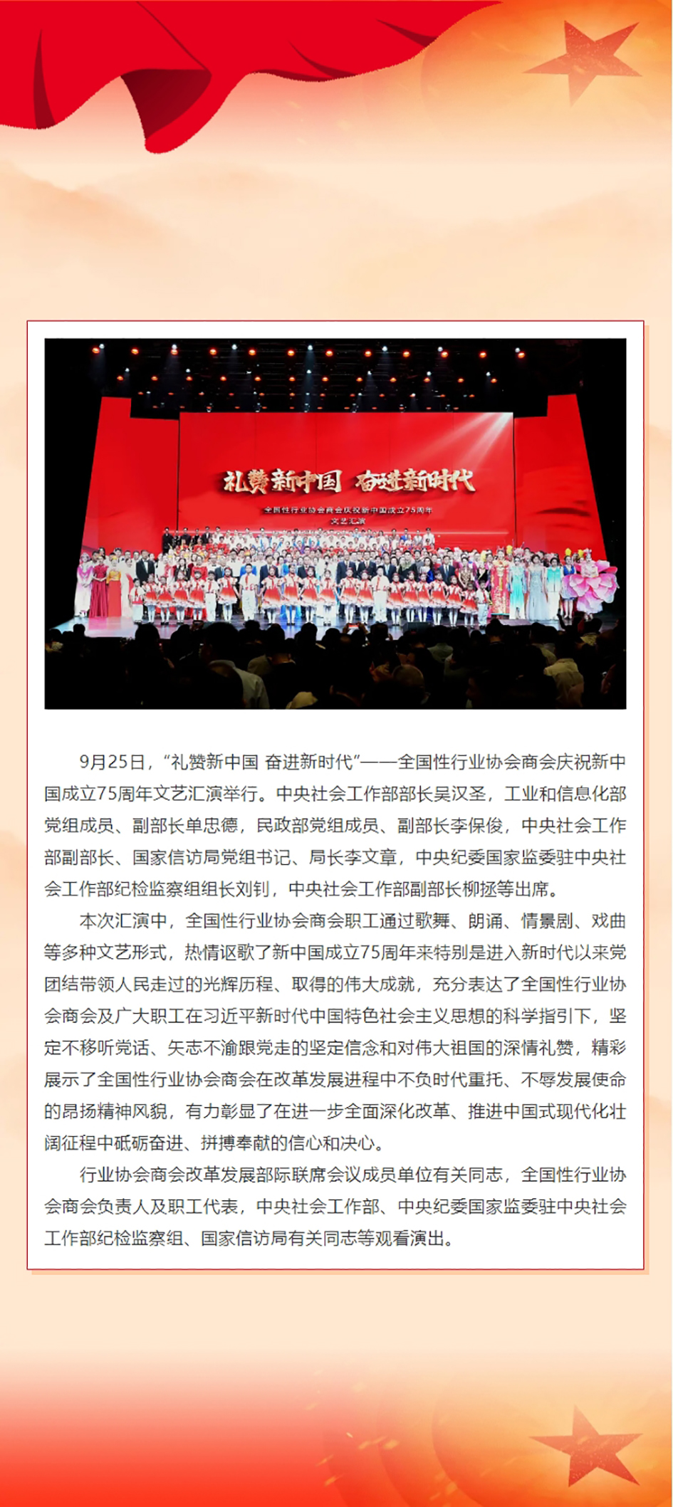| “礼赞新中国 奋进新时代”——全国性行业协会商会庆祝新中国成立75周年文艺汇演举行 |