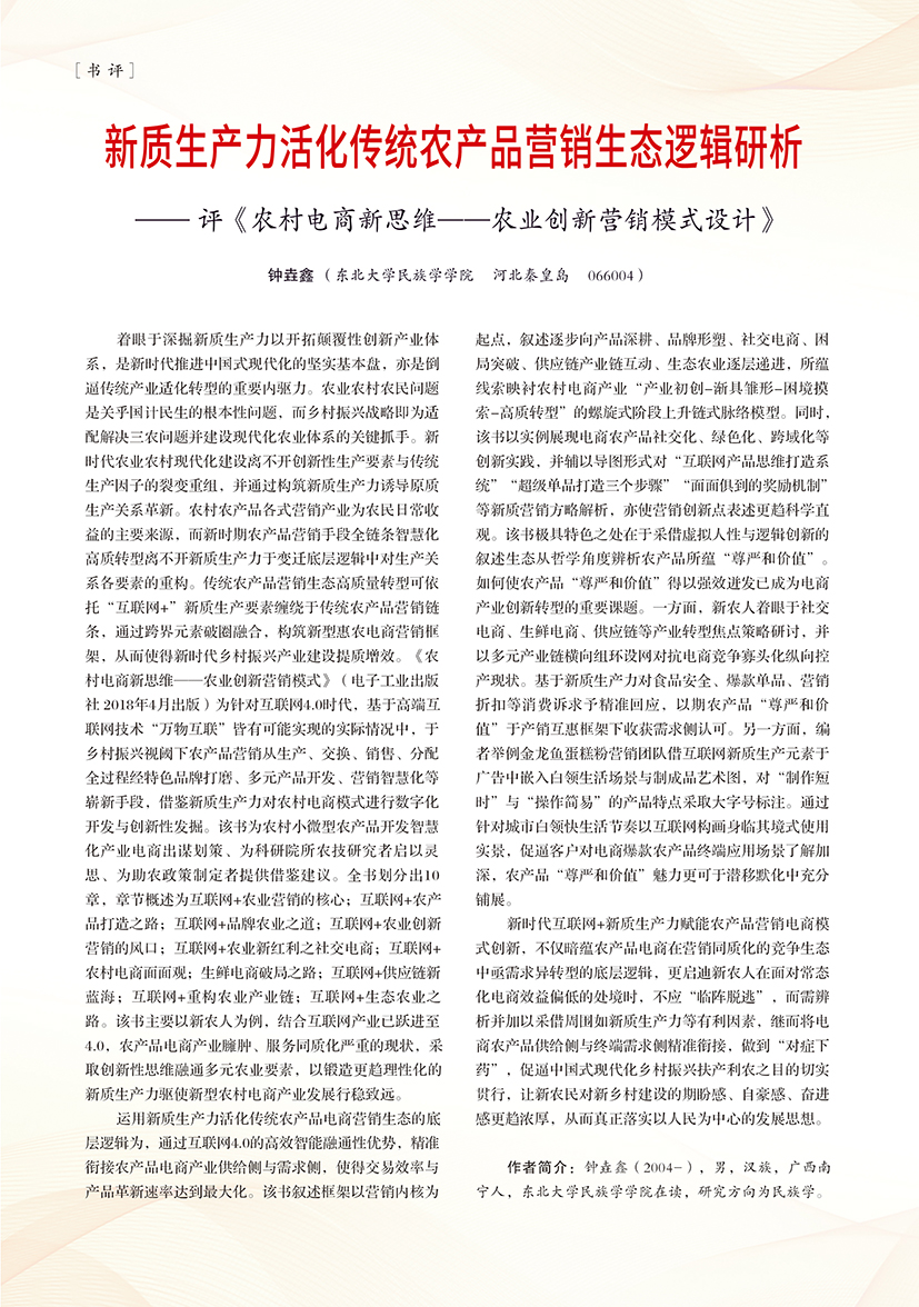 | 新质生产力活化传统农产品营销生态逻辑研析 ——评《农村电商新思维——农业创新营销模式设计》 |