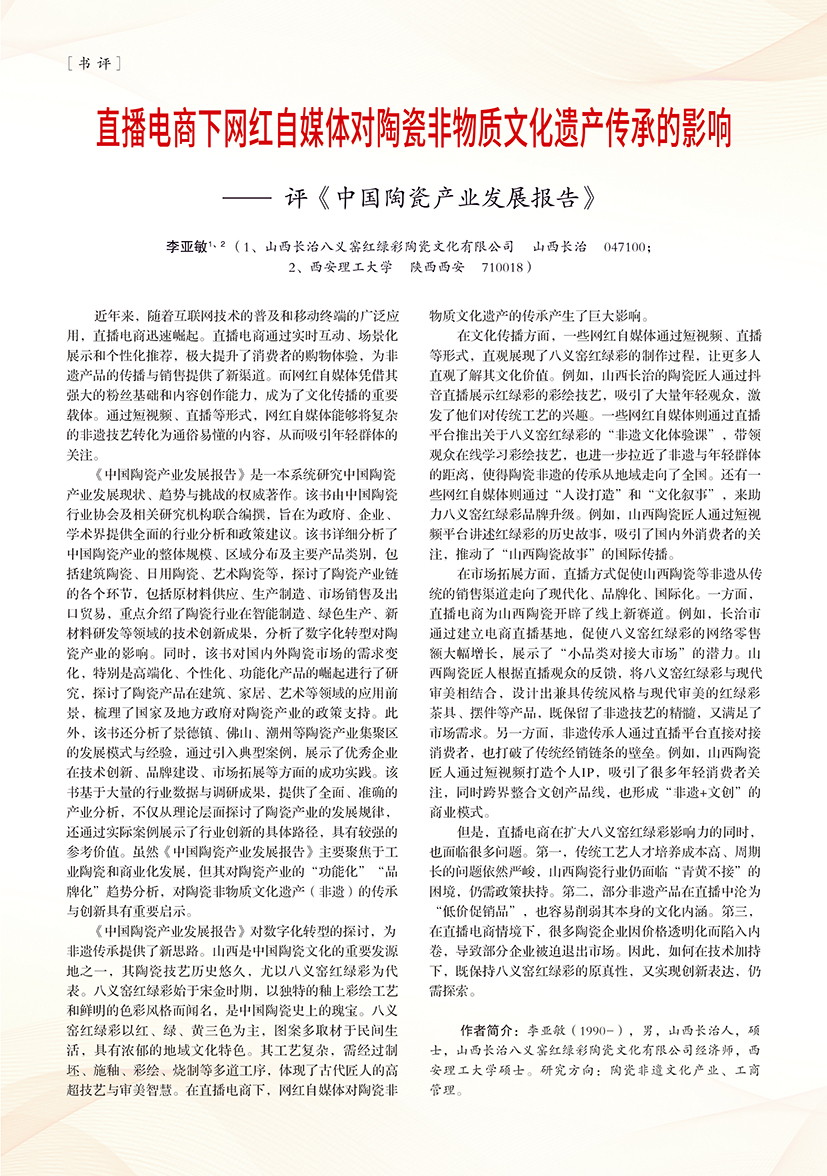 | 直播电商下网红自媒体对陶瓷非物质文化遗产传承的影响 ——评《中国陶瓷产业发展报告》 |