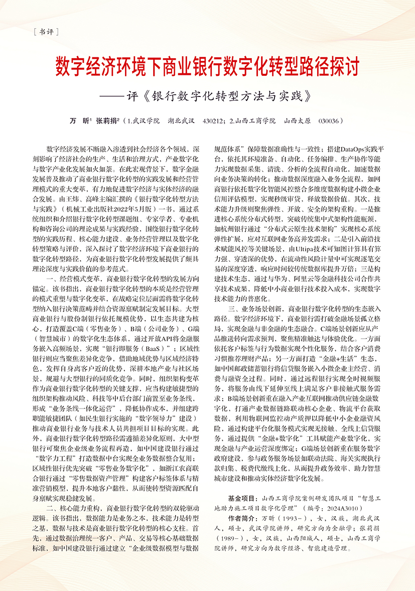| 数字经济环境下商业银行数字化转型路径探讨 ——评《银行数字化转型方法与实践》 |