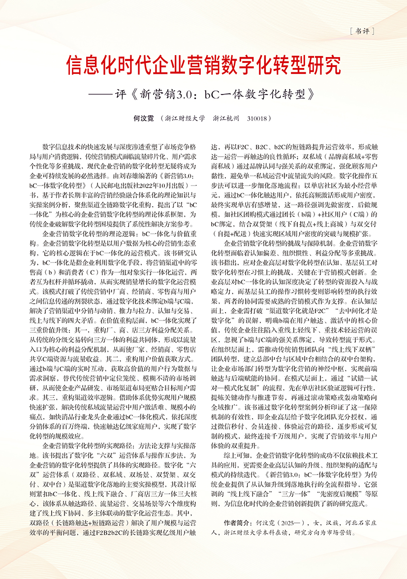 | 信息化时代企业营销数字化转型研究 ——评《新营销3.0:bC一体数字化转型》 |