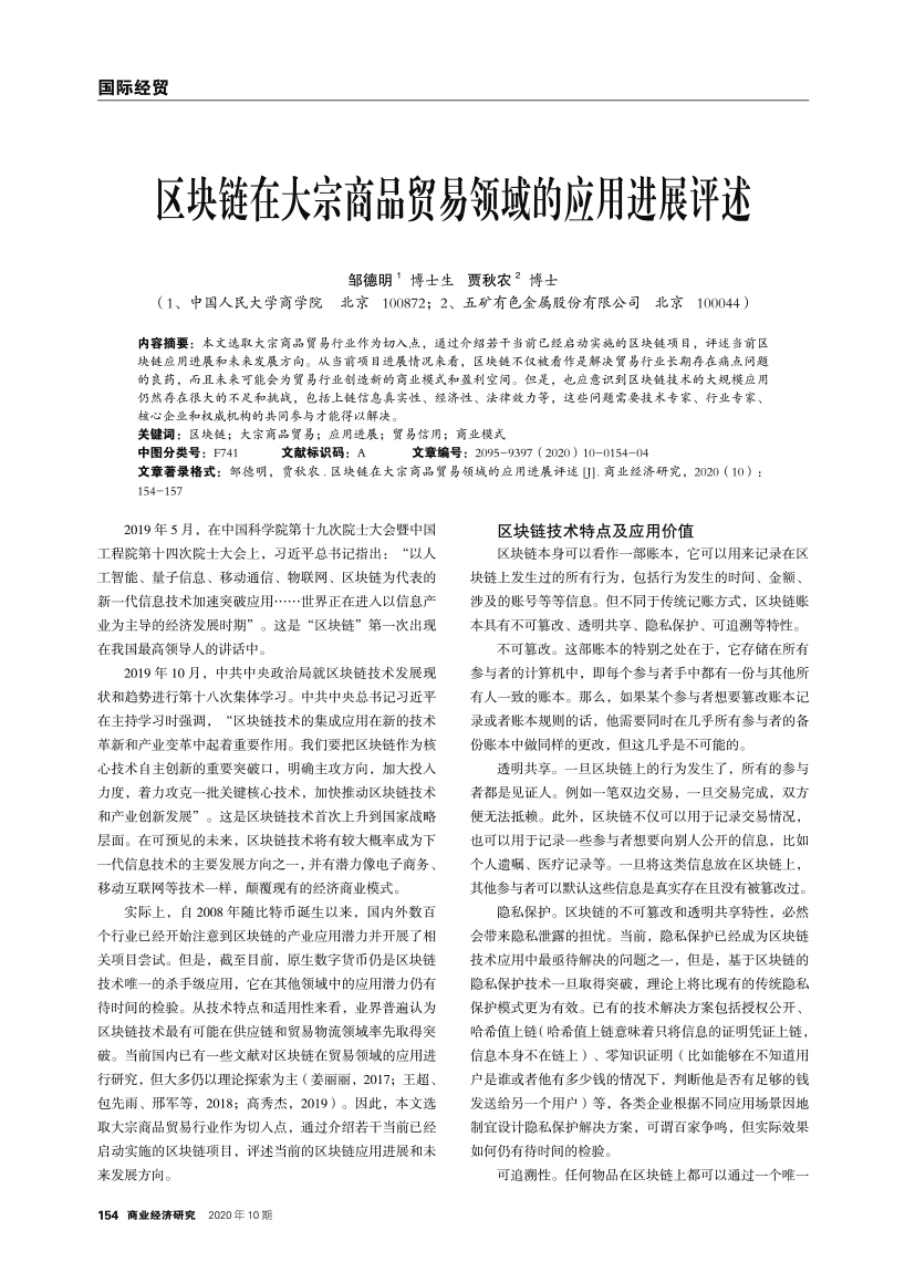 | 区块链在大宗商品贸易领域的应用进展评述 |