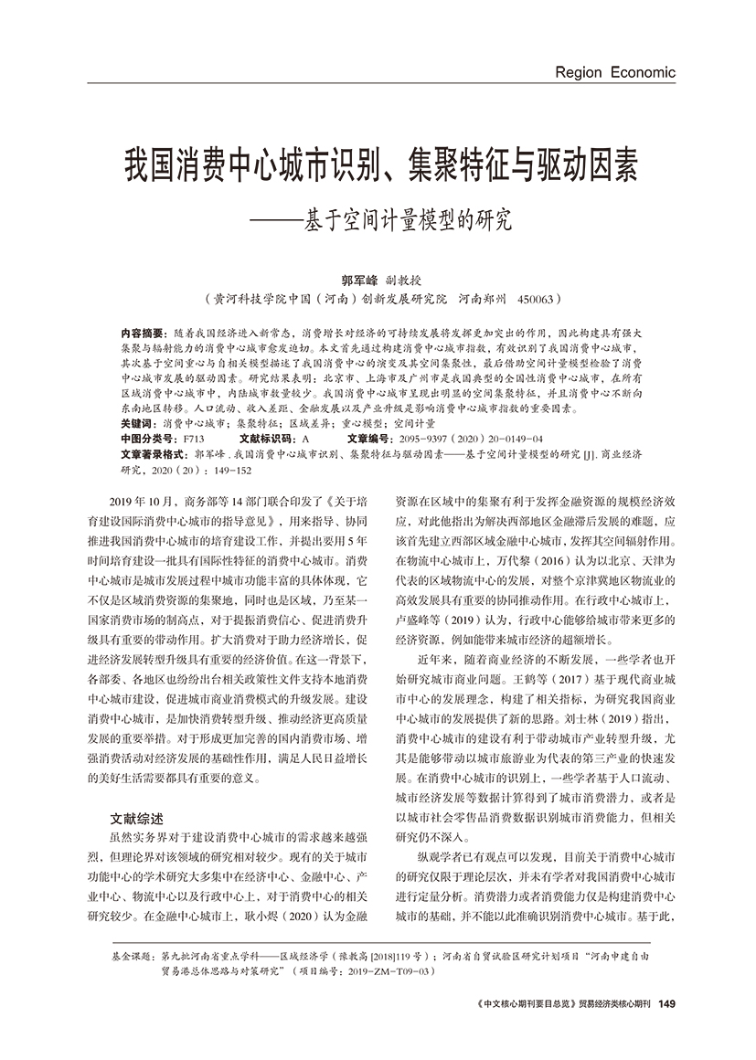 | 我国消费中心城市识别、集聚特征与驱动因素——基于空间计量模型的研究 |