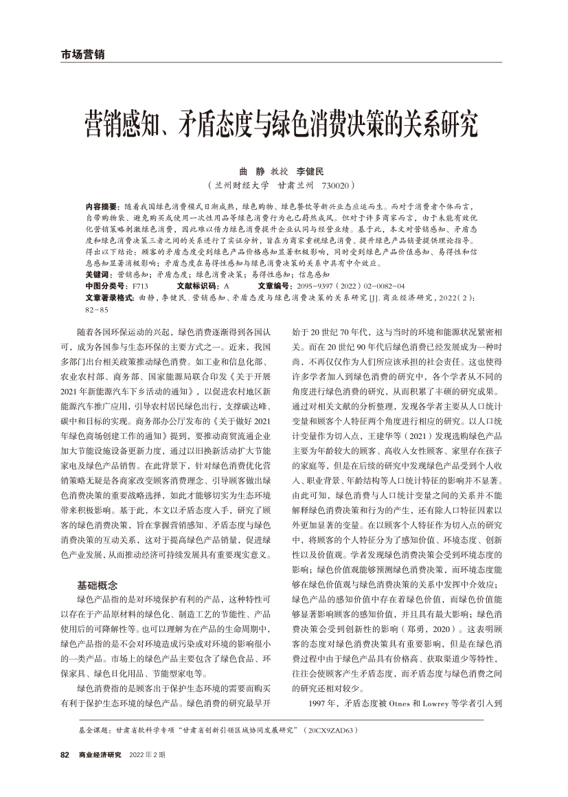| 营销感知、矛盾态度与绿色消费决策的关系研究 |