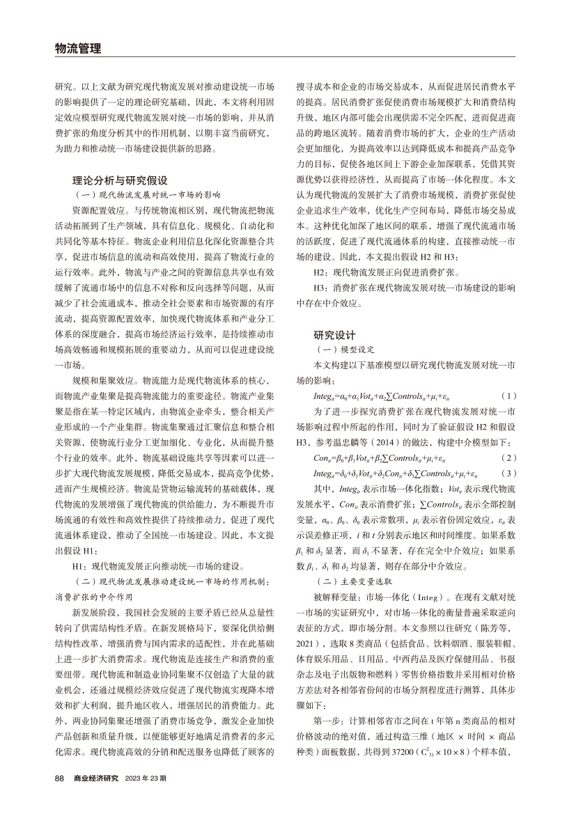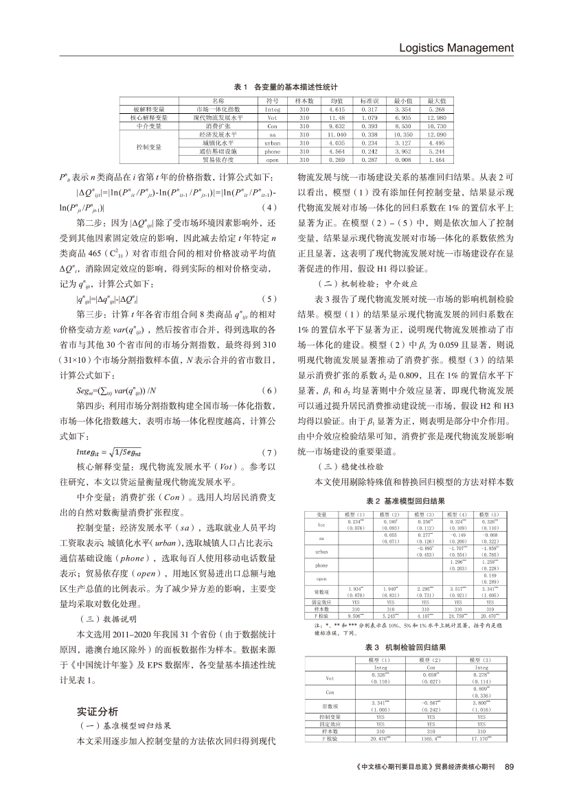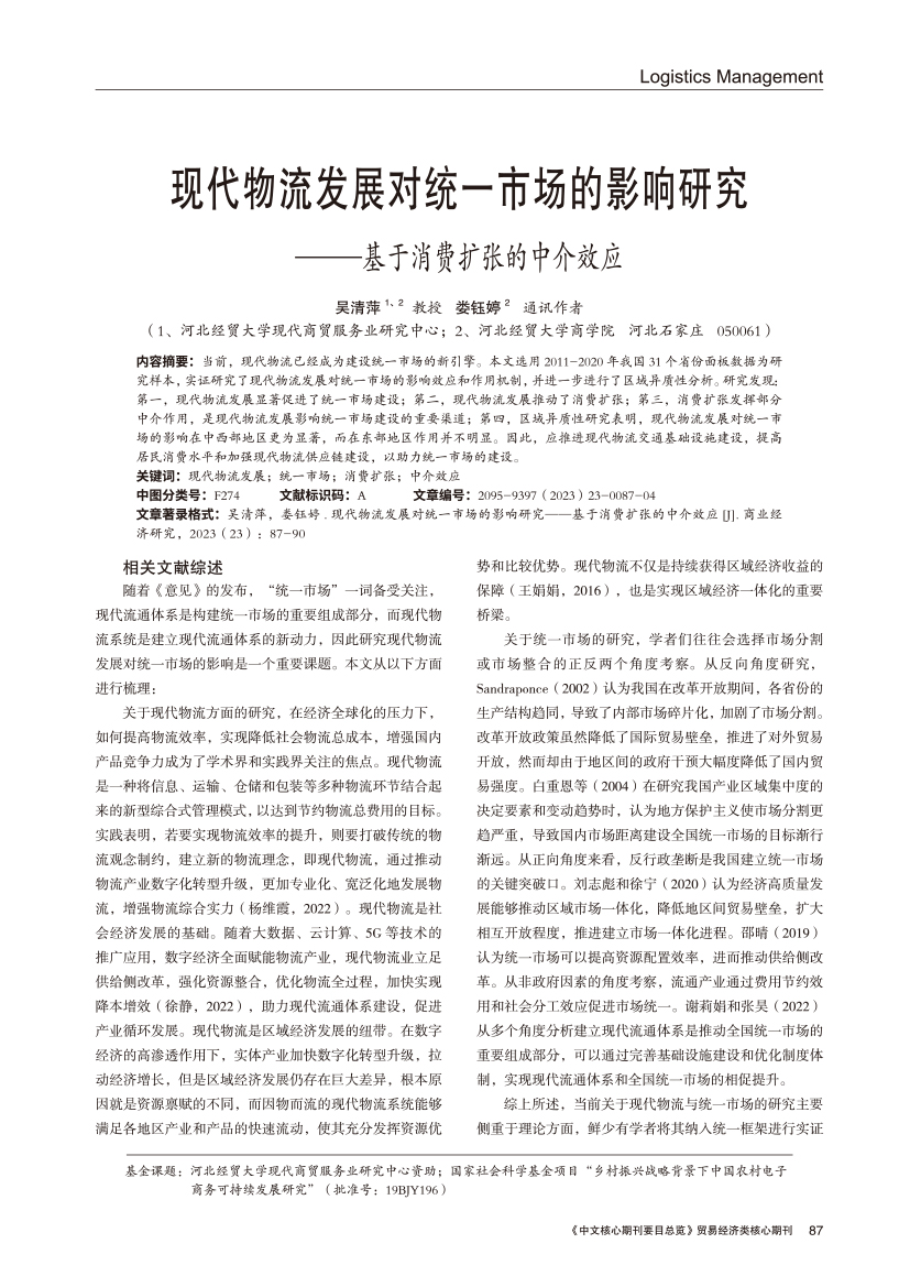 | 现代物流发展对统一市场的影响研究 ——基于消费扩张的中介效应 |