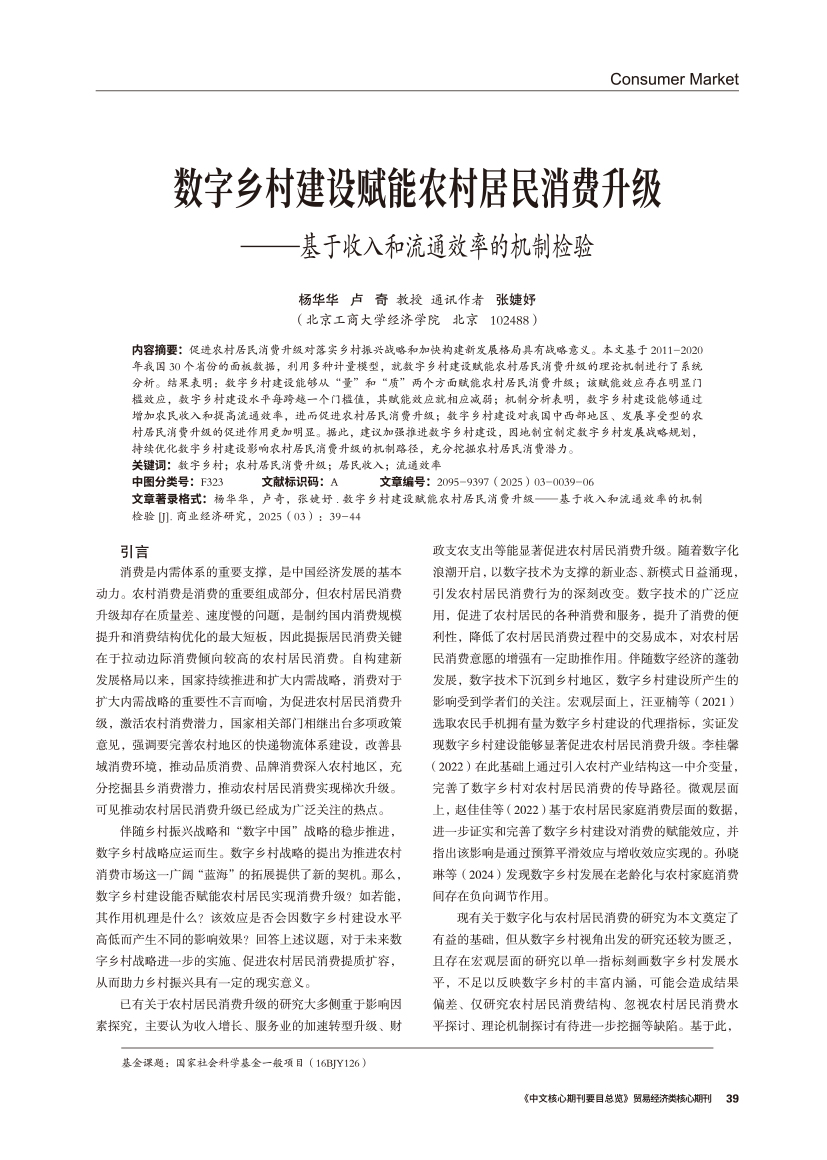 | 数字乡村建设赋能农村居民消费升级 ——基于收入和流通效率的机制检验 |