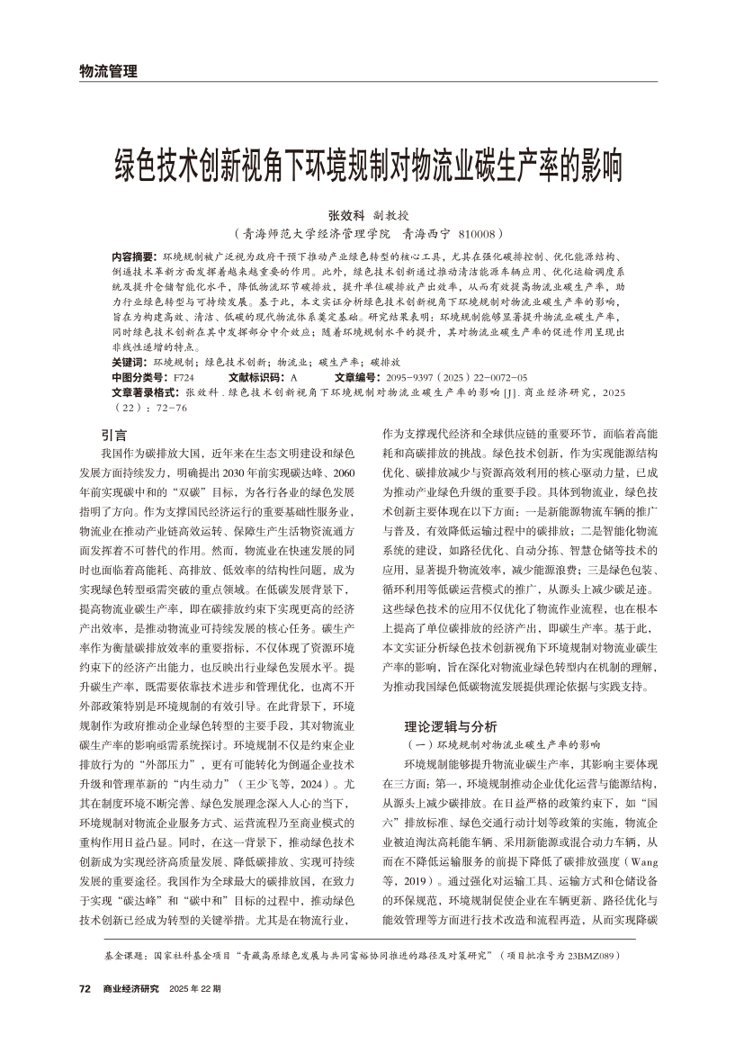 | 绿色技术创新视角下环境规制对物流业碳生产率的影响 |