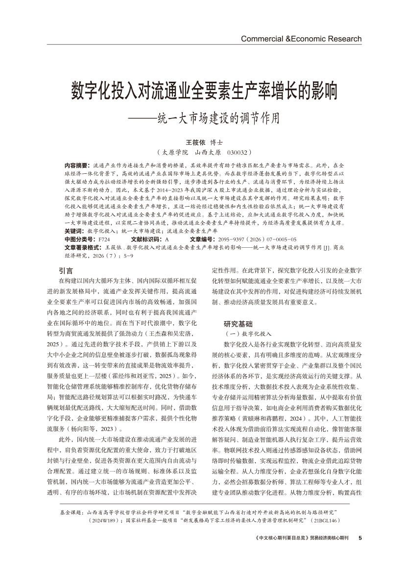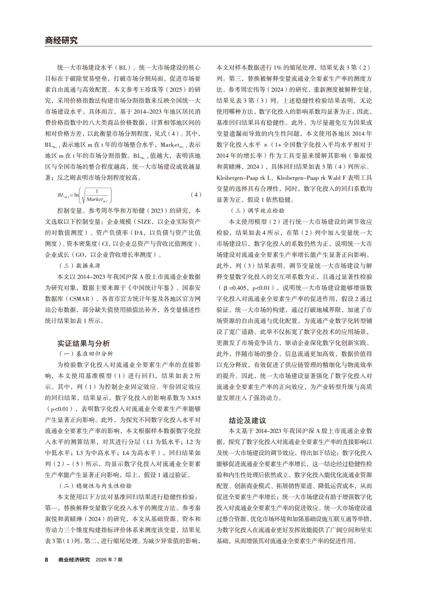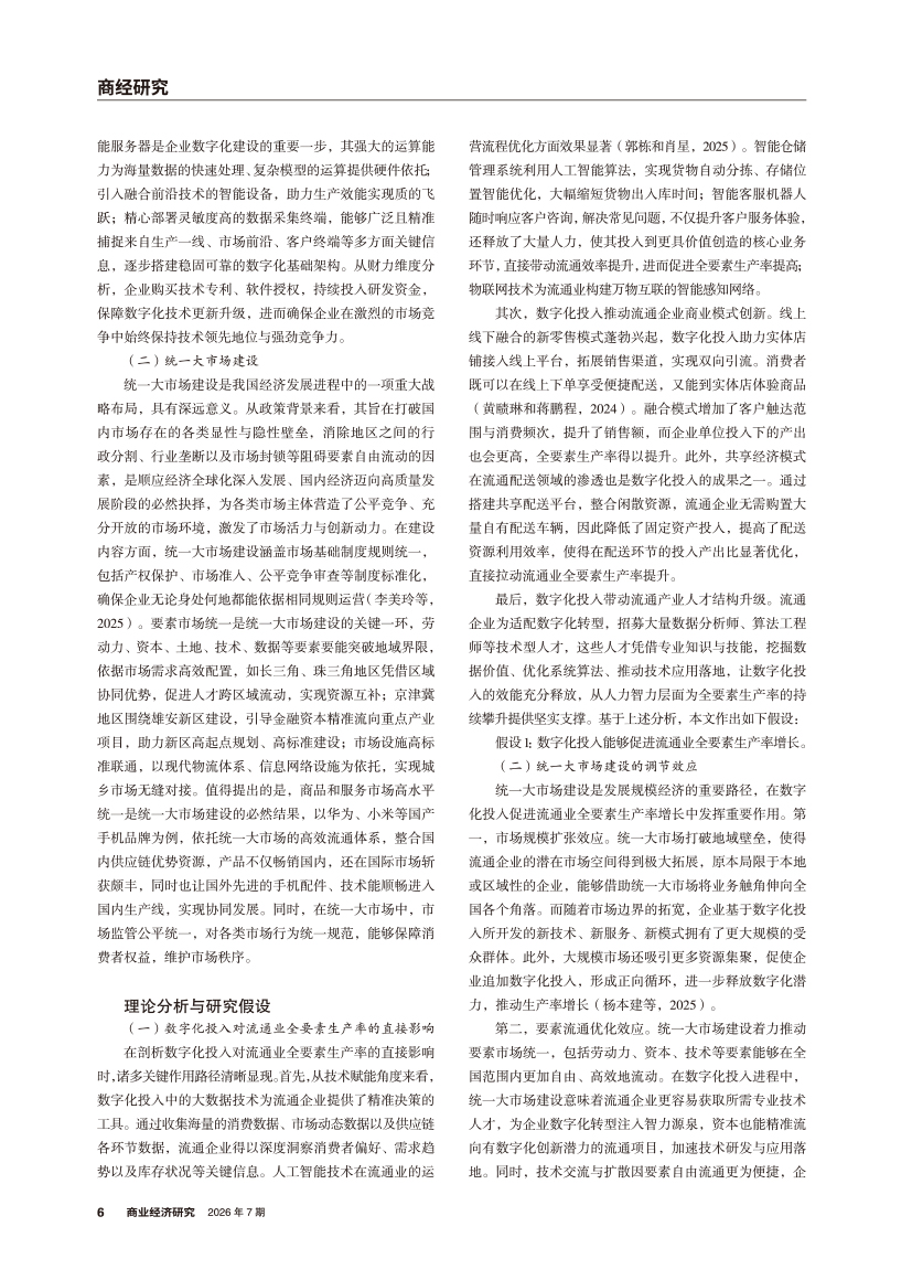 | 数字化投入对流通业全要素生产率增长的影响 ——统一大市场建设的调节作用 |